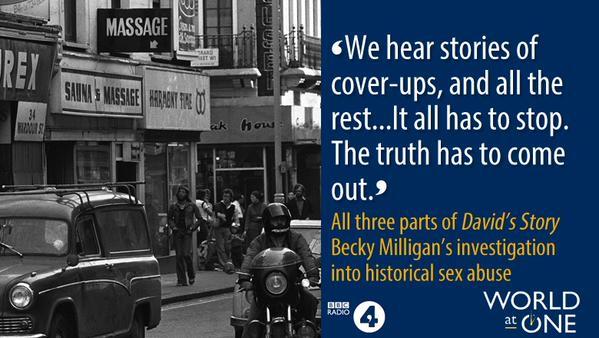 This is David's Story. He tells us he was abused by powerful businessmen, lawyers, senior military figures and former Conservative politicians, many of whom are now dead. This is Becky Milligan's full report - originally broadcast over 3 days - as she attempts to get to the truth of what happened forty years ago.